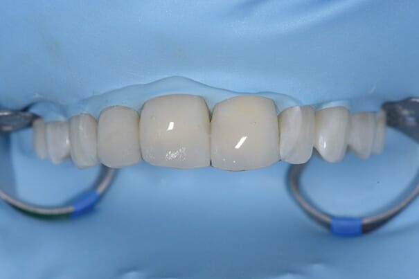Prior to the restorative procedure, a home bleaching procedure was carried out with Opalescence 10% (Ultradent). In addition, a palatal silicon index was produced to record the shape and morphology of the existing restorations and dentition.
