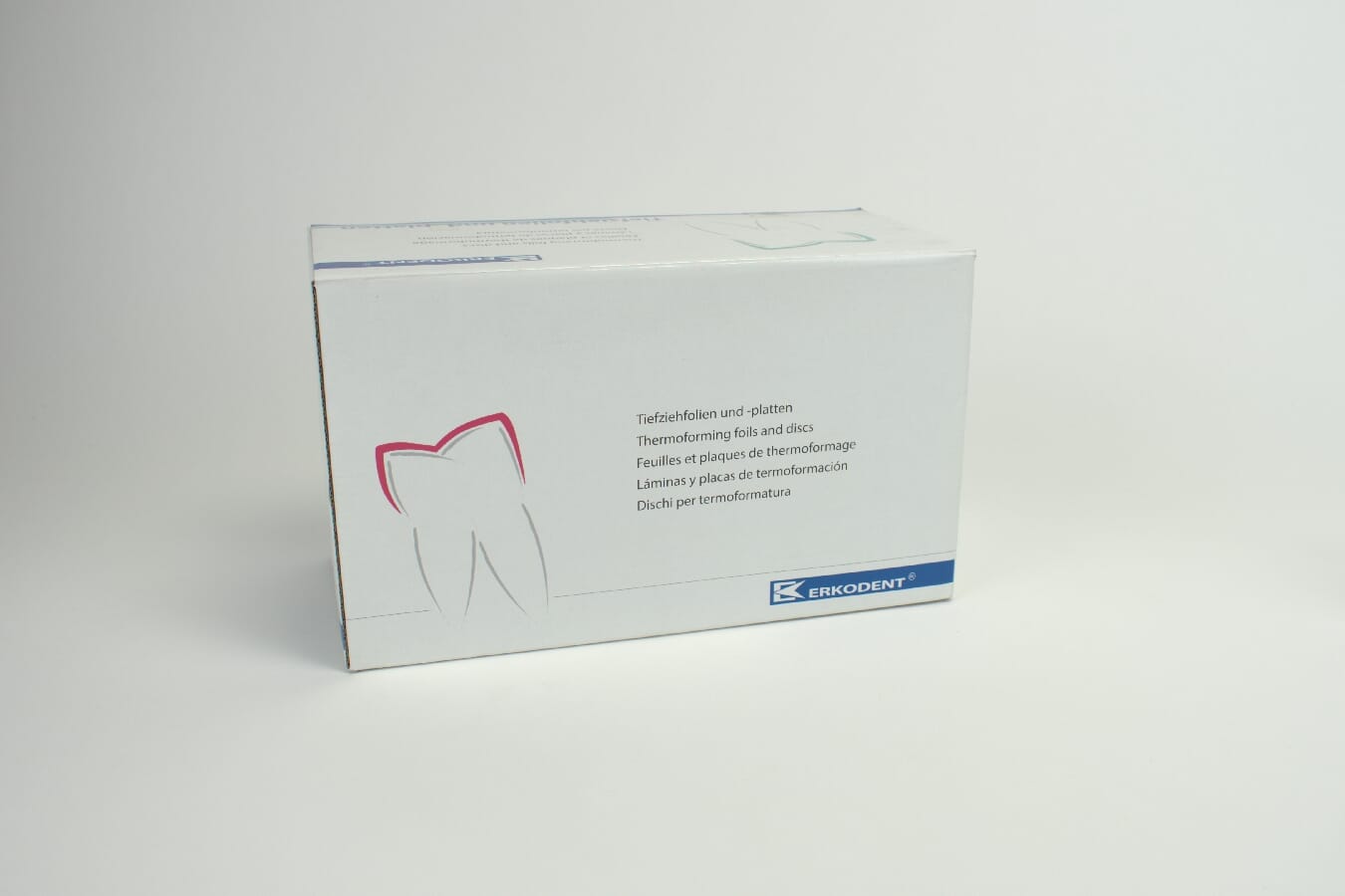 Plate for vakuumforming til biteskinner o.l. Består av en hard plate samt et 0,4 mm tykt mykt lag.