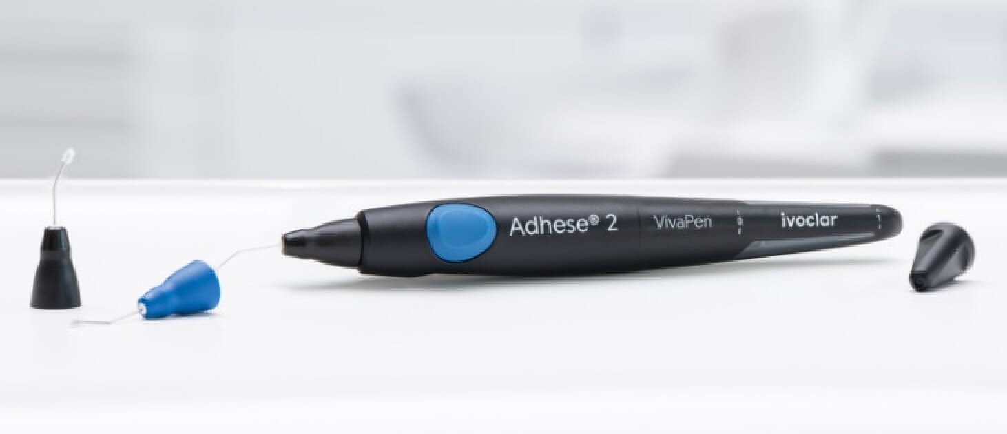 Takket være den blå blanderspissen kan den dualherdende bondingen påføres direkte fra VivaPen