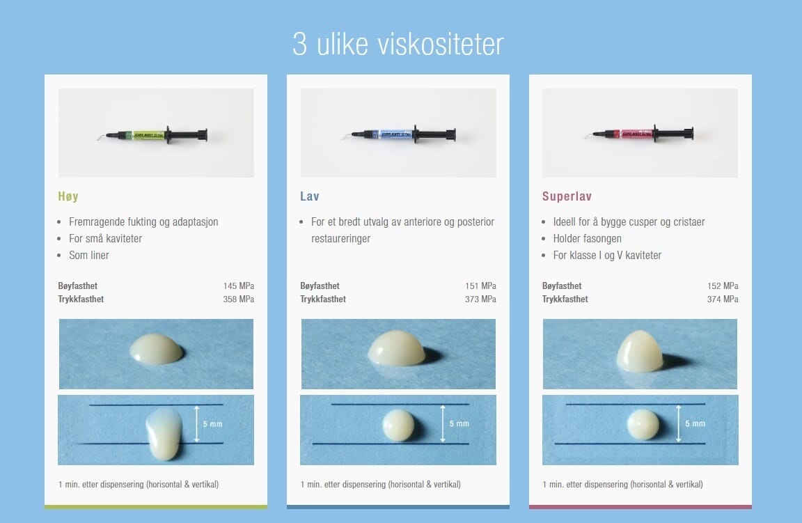Den lave viskositeten gjør at kompositten lett flyter inn i små områder og fissurer, samtidig som den gir en jevn og kontrollert applisering fra sprøyten. Dette bidrar til god kanttilpasning og reduserer risikoen for luftbobler.
