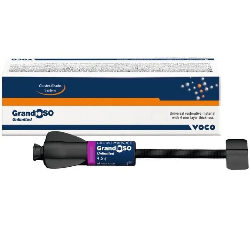 GrandioSO® Unlimited er et nanohybridkompositt. Universalkompositten dekker alle 16 VITA-fargene i bare 5 klyngenyanser med en herdedybde på 4 mm.