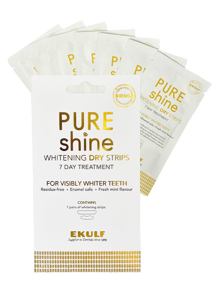 PURE shine Whitening Dry Strips fra EKULF gir deg naturlig hvitere tenner på bare 7 dager – enkelt og skånsomt hjemme. De tynne, transparente stripsene har en avansert, tørr formel som holder seg godt på plass uten å klisse, og et diskret design som knapt er synlig ved bruk. Stripsene tilpasser seg tennenes form takket være en innovativ gelteknologi som aktiveres ved kontakt med spytt – og gir en jevn og effektiv bleking. Den aktive ingrediensen PAP (Phthalimidoperoxycaproic Acid) løser skånsomt opp overfladiske misfarginger – helt uten hydrogenperoksid. Produktet er trygt for emaljen, skånsomt mot tannkjøttet og etterlater ingen gelrester etter bruk.