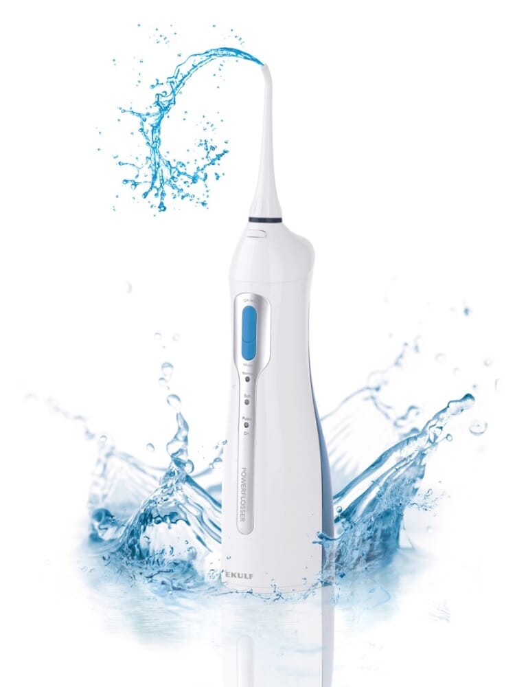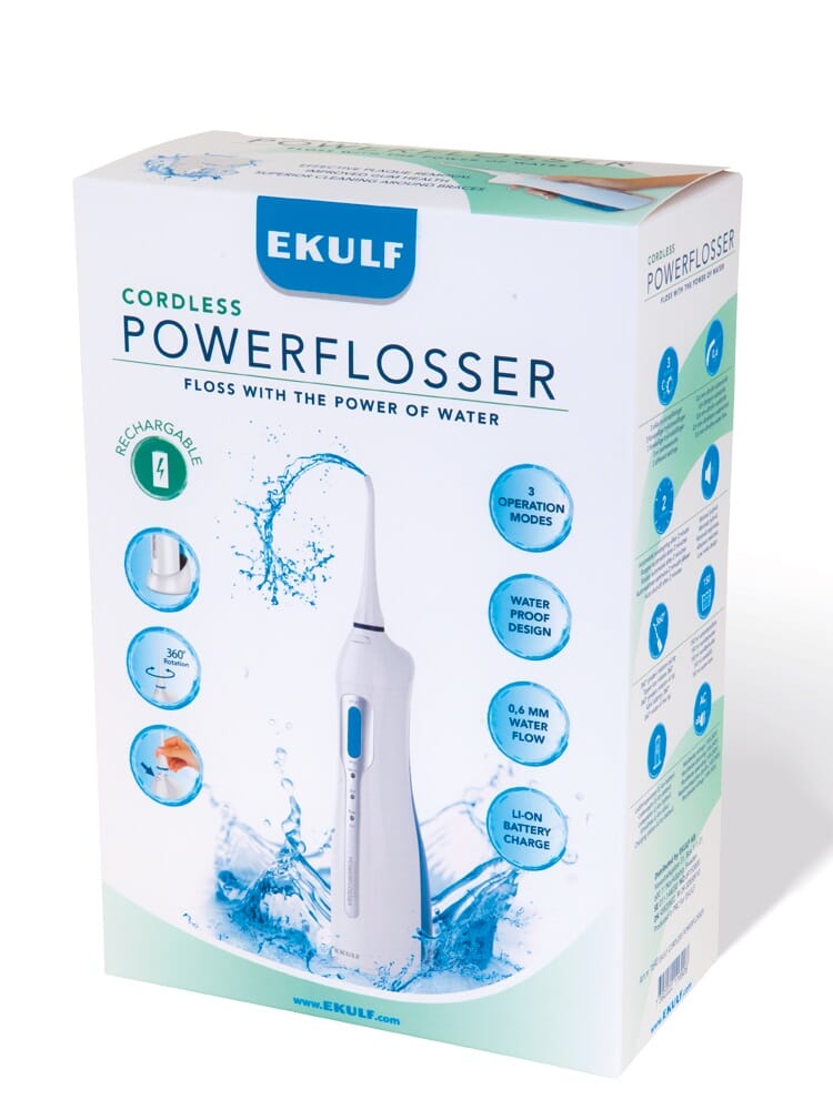 EKULF PowerFlosser Cordless fjerner plakk og bakterier mellom tennene og dypt ned i tannkjøttlommene der vanlig tanntråd ikke kommer til. Vannstrålen (0,6 mm tykk) pulserer 1400 ganger pr minutt, masserer tannkjøttet og gir en økt blodsirkulasjon. Holder tannkjøttet ditt friskt og sterkt og er mere skånsom enn tradisjonell tanntråd. Tippen kan roteres 360 grader og strålen gjør det enklere å rengjøre rundt tannreguleringer, broer og implantater. Vannbeholderen rommer 1,5 dl vann og lades via en ladningsstasjon, (li-on batteri) for lettvint bruk på badet. Powerflosseren har automatisk avstengning etter 2 minutter og har et minimalt lydnivå.