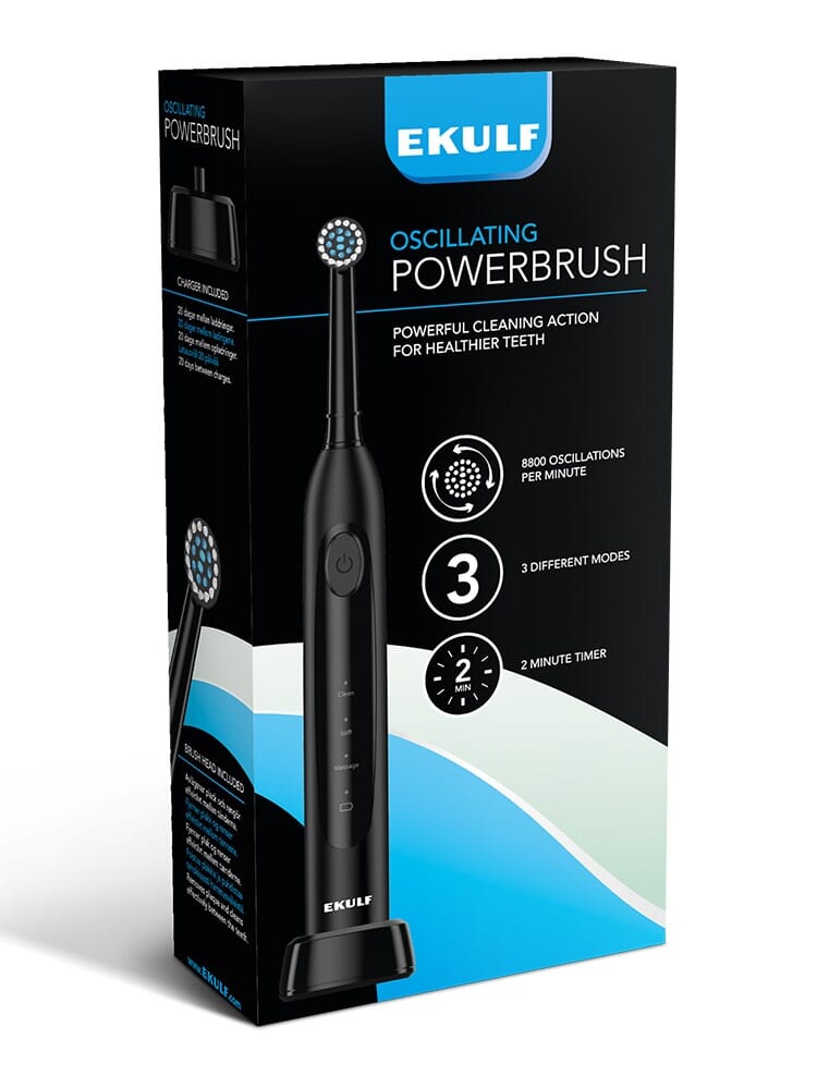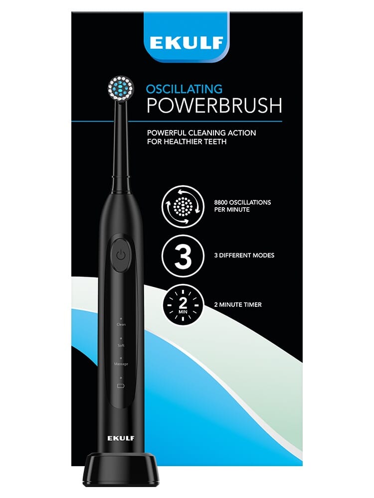 EKULF Oscillerende PowerBrush tilbyr flere rengjøringsmoduser for å passe dine individuelle behov. Velg mellom CLEAN, SOFT og MASSASJE for en tilpasset og skånsom rengjøring. Med opptil 8800 børstebevegelser per minutt genererer EKULF Oscillerende PowerBrush kraftig rengjøring for sunnere tenner. Følg de enkle instruksjonene i den medfølgende håndboken for å få mest mulig ut av din EKULF Oscillerende PowerBrush.