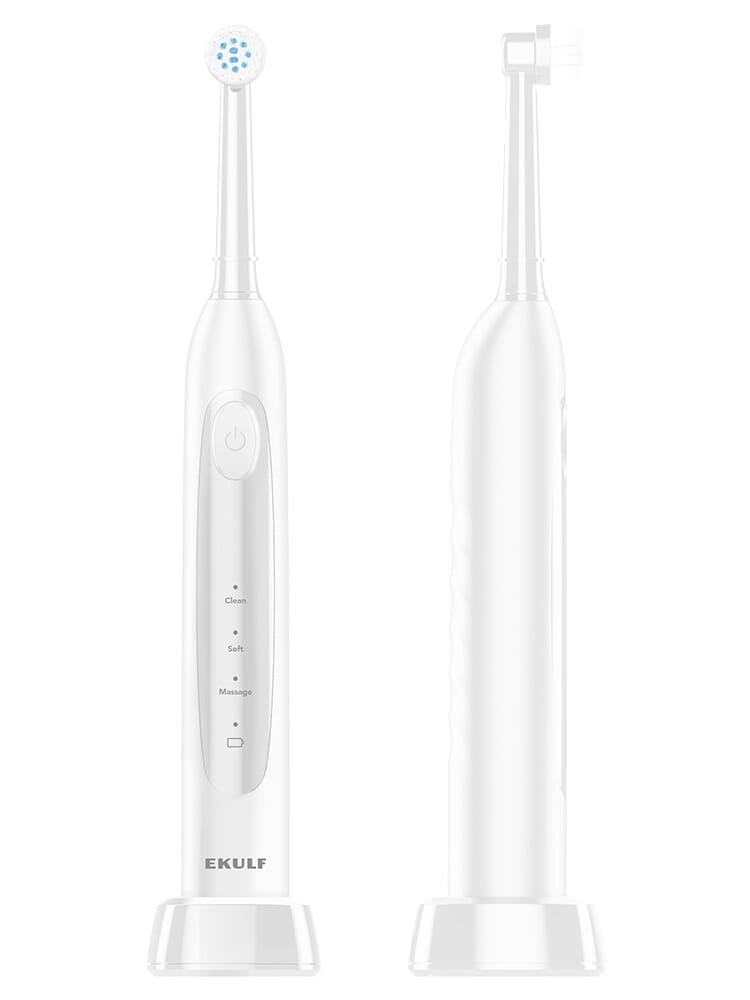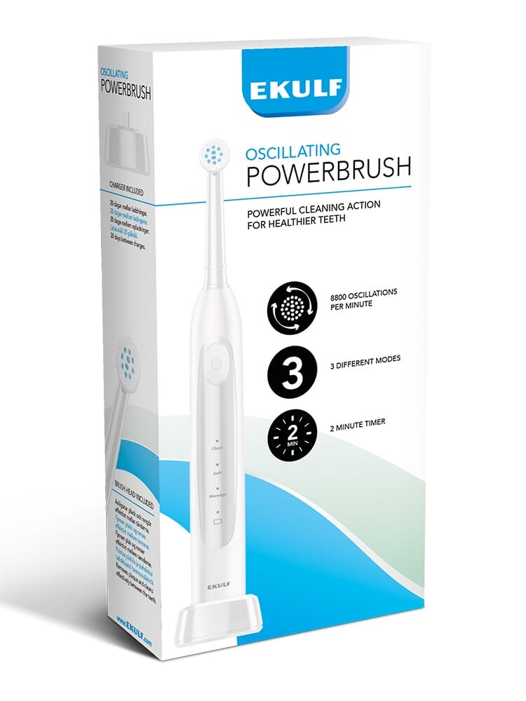 EKULF Oscillerende PowerBrush tilbyr flere rengjøringsmoduser for å passe dine individuelle behov. Velg mellom CLEAN, SOFT og MASSASJE for en tilpasset og skånsom rengjøring. Med opptil 8800 børstebevegelser per minutt genererer EKULF Oscillerende PowerBrush kraftig rengjøring for sunnere tenner. Følg de enkle instruksjonene i den medfølgende håndboken for å få mest mulig ut av din EKULF Oscillerende PowerBrush.