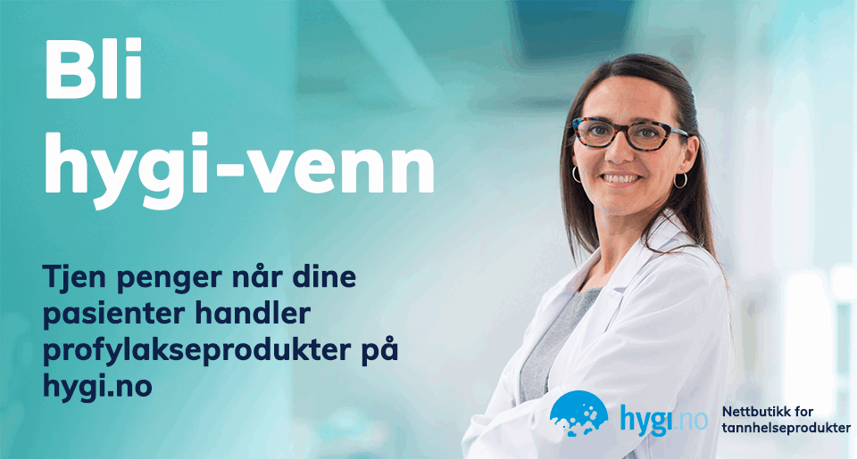 Nå har du mulighet til å benytte hygi.no som din klinikks nettbutikk. Ved å registrere deg som hygi-venn i skjemaet til høyre vil du motta en gratis startpakke med informasjonsdisplay, pasientkort og informasjon om hygi.no og hygi-venn. Samtidig registrerer vi deg som hygi-venn på hygi.no slik at dine pasienter kan knytte sine innkjøp til din klinikk. Når dine pasienter handler får du 15 % provisjon fra første krone. Provisjonen sendes til deg i form av en kreditnota som utstedes hvert kvartal.