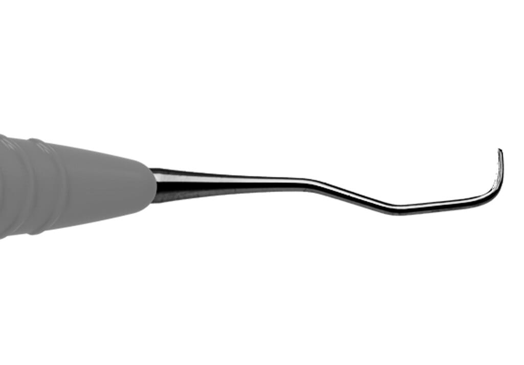 Gracey 1-2 brukes oftest på incisiver. Bruk moderat trykk ved fjerning av kalk og lett trykk ved rotplanering, og sørg for at det nedre skaftet på Gracey-kuretteren er parallelt med tannoverflaten.