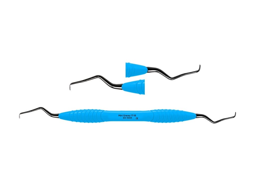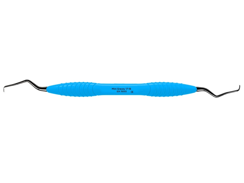 MA Dentals Mini Gracey 17-18 IDX Sharp-instrument brukes til å fjerne dyp subgingival tannstein. Det er helt vedlikeholdsfritt, polert og robust, og gir langvarig skarphet. Det er perfekt for tannleger og tannpleiere som ønsker lavt vedlikehold og høy presisjon ved fjerning av dyp subgingival tannstein. Instrumentet har et mer vinklet blad- og skaftdesign enn Mini Gracey 15-16, noe som gir enklere tilgang. Det gjør det lettere å nå molarer i områder hvor andre Mini Gracey-instrumenter er vanskelige å posisjonere. Det brukes primært på mesiale flater av bakre tenner.
