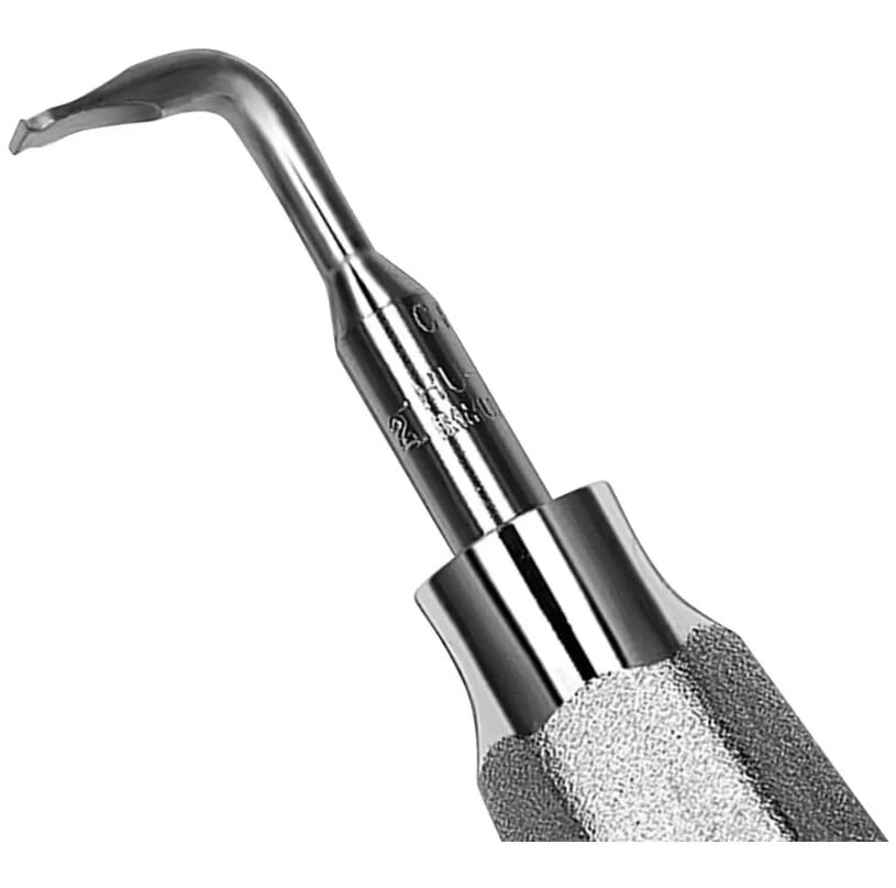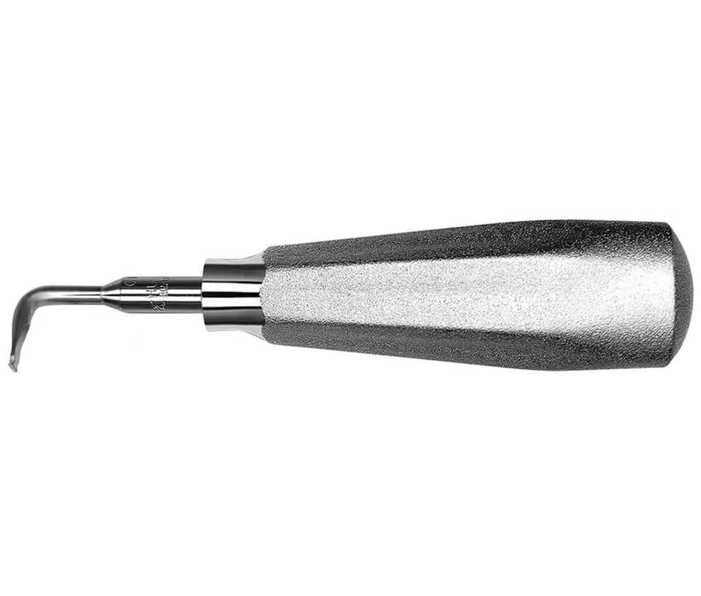 Det lille rotløfterhåndtaket og den hakkede spissen sikrer et sikkert grep og muliggjør kontrollert arbeid når sementforseglingen brytesTrykket på tannen reduseres, noe som minimerer risikoen for emalje brudd