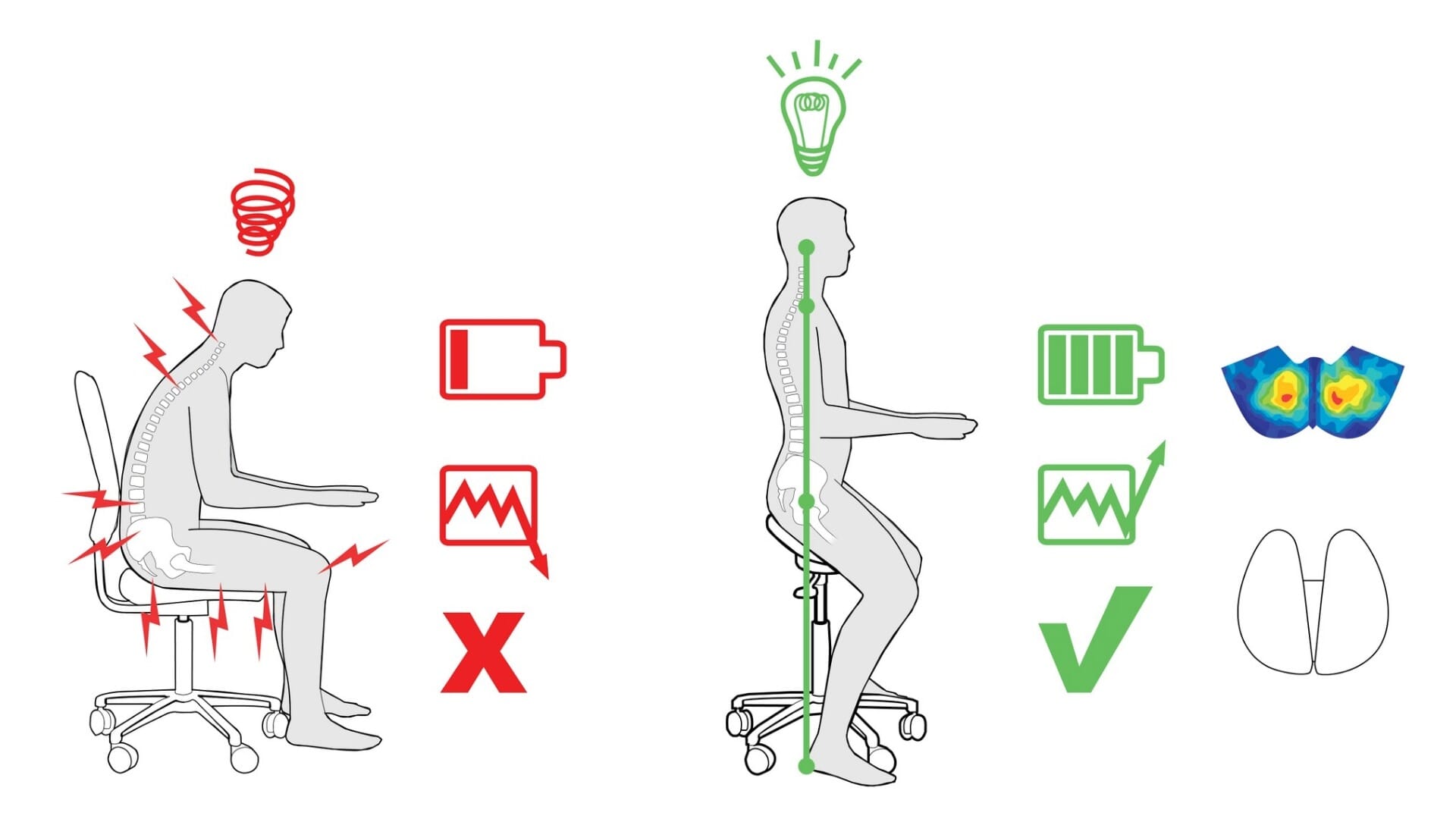 På en sadelstol vil hofter og knær ha en 135 graders vinkel, noe som senker trykket i brusken. Dette forbedrer metabolismen og reduserer risiko for leddplager. Den oppmuntrer også til aktiv bruk av kjernen, bekkenet og bena, slik at kroppen holdes aktiv selv når du sitter lenge.